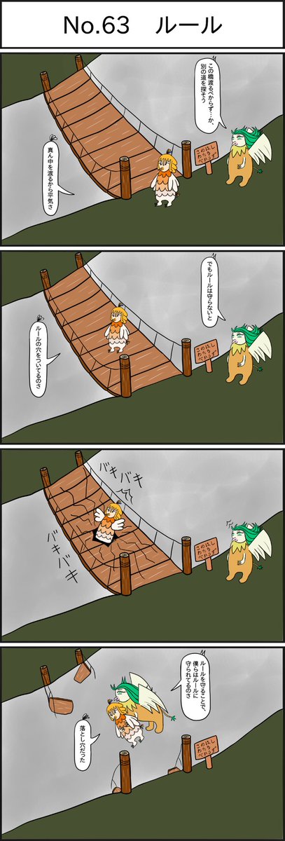 イギリス人はまた崩落すると思って渡らなかった。 幽霊が出るので立て札があると思った。 幽霊を見たかったので橋を渡った。 橋が崩落。自分が幽霊になった。このはしわたるべからず(動画あり) どこかの つるっパゲ が屁理屈こねて 「はし」が本来指している橋を端とのたまい、橋を渡ったという話がある。 クロノスには橋をかけて渡るシステムが火山島にある。 この橋渡るべからず、やってやろうじゃないか。『あつまれ どうぶつの森』で「この橋渡るべからずバグ」発生、鍵となるのは禁断の「4段目の崖」。夏の訪れとともに現れた怪奇現象と、その解決策 automaton 『あつまれ どうぶつの森』にて夏の無料 アップデートが配信された。